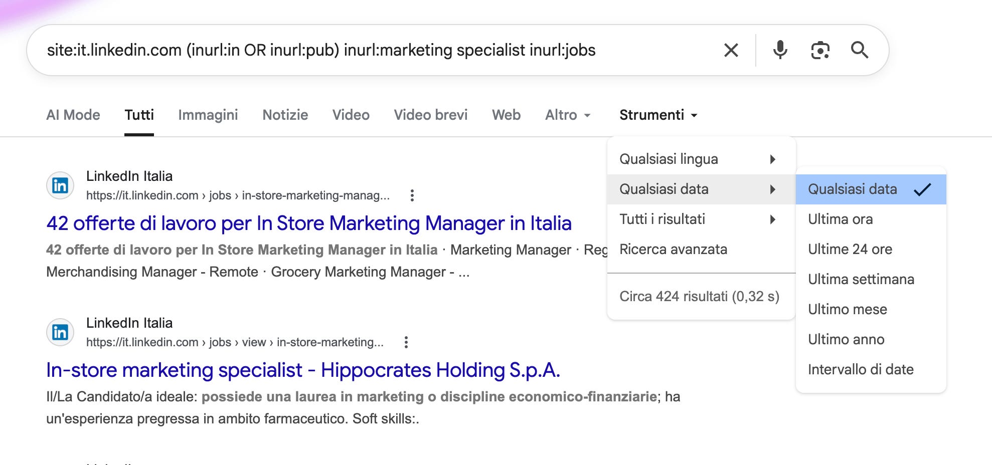 quello con il profilo di lavoro ricercato (nell’esempio ho cercato offerte come “marketing specialist” inurl:marketing specialist ma puoi mettere quello che preferisci es. ingegnere);