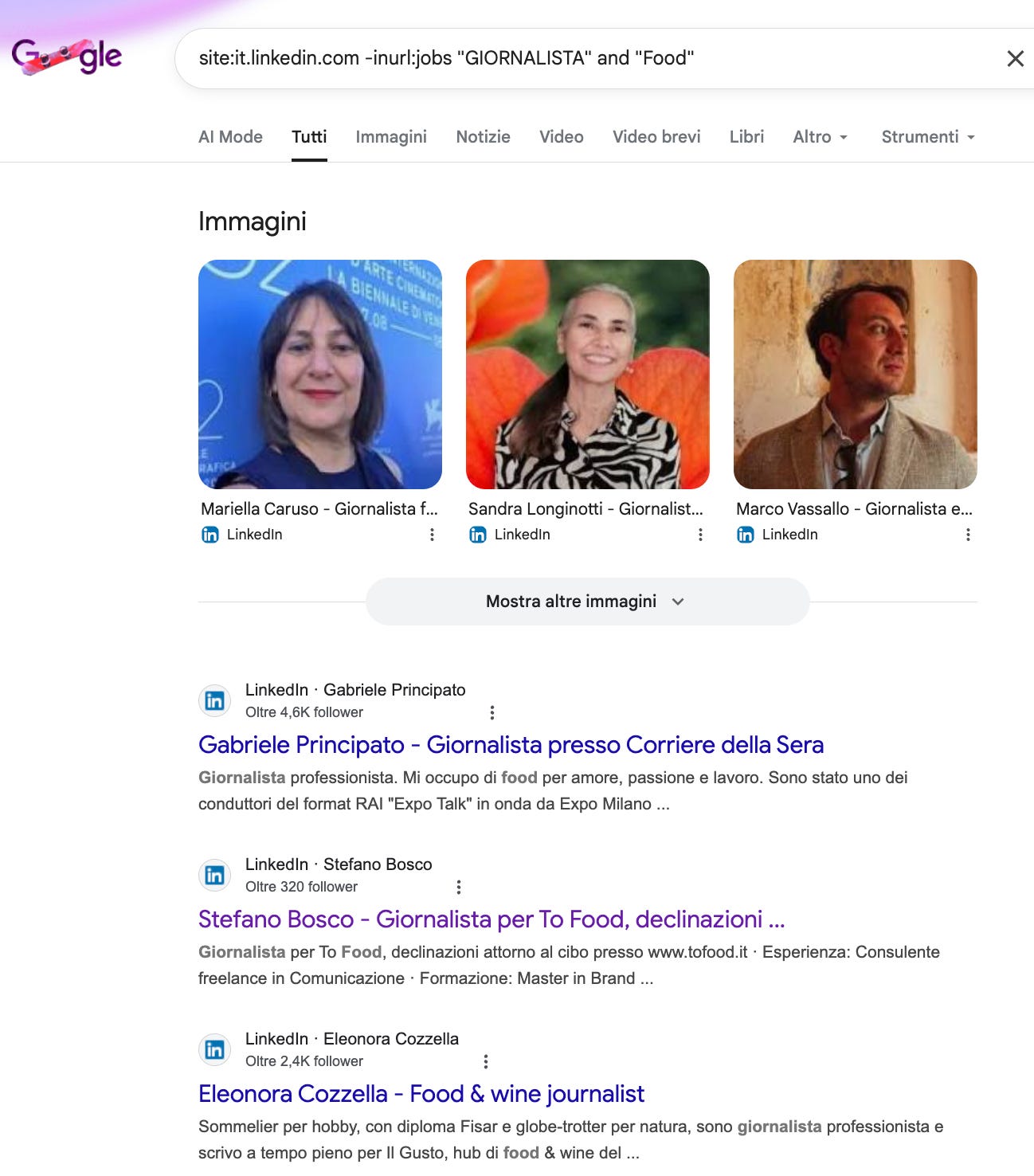 Risultato: Otterrai una lista molto più pulita di singoli professionisti - direttamente nei risultati di ricerca Google Search - che si definiscono giornalisti nel settore food.